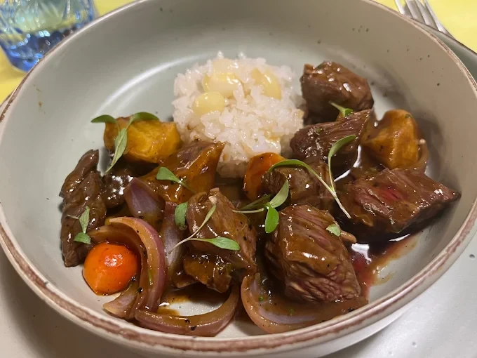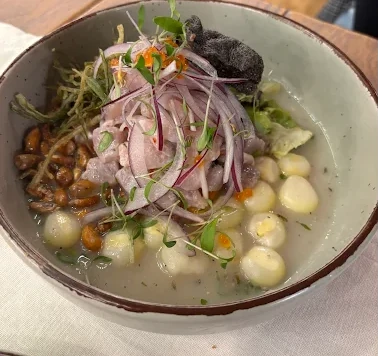 El ceviche clásico peruano es uno de los imprescindibles: pescado fresco, leche de tigre bien equilibrada y ese punto ácido que despierta el paladar. La picaña de buey a la parrilla con carbón y leña de encina aporta intensidad y aroma ahumado muy marcado.