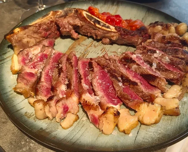 El Menú Aura sorprende desde el inicio con combinaciones como las judías verdes naturales con huevo poché, patata revolcona y alioli de ajo negro, o la reconfortante sopa de cebolla a la francesa. La propuesta continúa viajando entre sabores intensos y delicados: espaguetis con salsa de foie, pesto trufado y reineta; garbanzos pedrosillanos con gambones; ensaladilla con ventresca en escabeche. En los principales, el producto brilla con elaboraciones como el bacalao confitado con beurre blanc de manzanilla, el tataki de atún envuelto en alga nori con crema de coliflor en miso y jugo de jengibre, el rodaballo a la brasa o el mogote ibérico asado a la naranja. También destacan cortes a la brasa como el entrecot con salsa Café de París o la chuleta de vaca madurada, siempre acompañados de guarniciones cuidadas. El final dulce mantiene el nivel con propuestas como la tarta cremosa de tres quesos, la torrija brioche con crema de espéculos y helado de arroz con leche, el bizcocho de chocolate con crema de mandarina o el semifrío de arándanos.