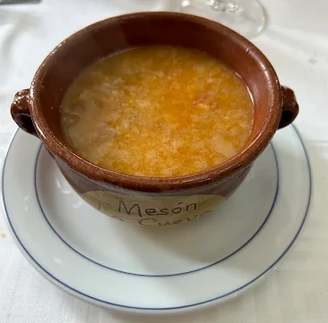 Sopa castellana, sopa de ajo, sopa de marisco, alubias con tropezones, habas con jamón ibérico o caldo de la casa.